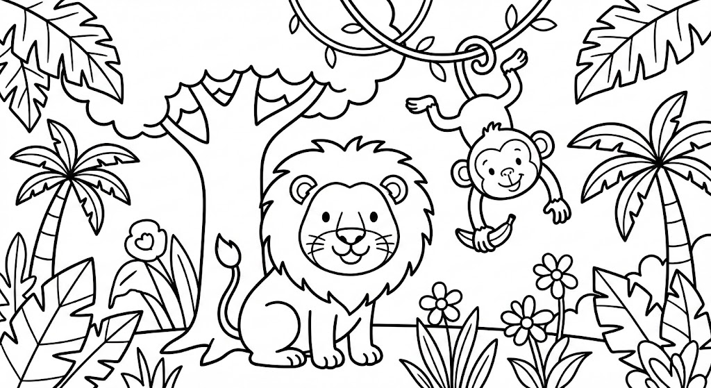 Color this amazing wildlife scene featuring a lion, monkey, and trees! This animal coloring page is perfect for kids who love jungle animals and nature. Bring this wild adventure to life with your favorite colors as you paint the majestic lion, playful monkey, and lush forest trees.