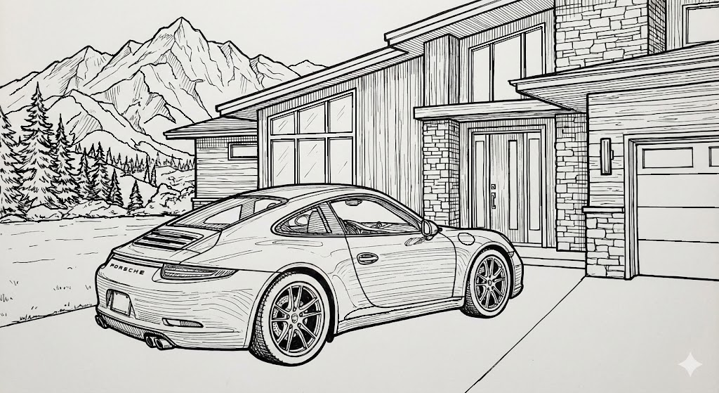🏔️ Mountain House Coloring Page - Sports Car, House and Mountain with Trees