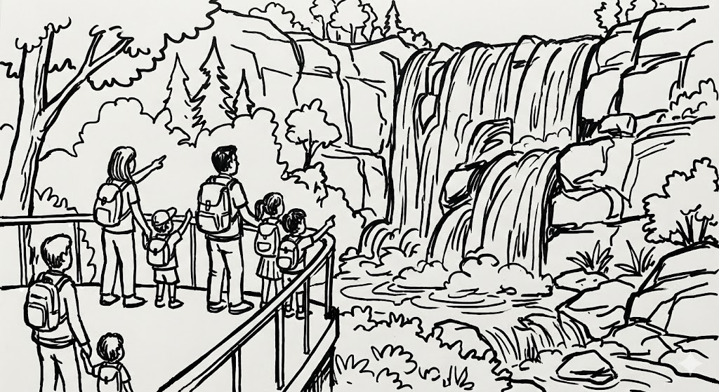 Color this beautiful waterfall scene with trees, a flowing river, and kids watching the waterfall! This nature coloring page is perfect for kids who love waterfalls and outdoor adventures. Paint the cascading waterfall, green trees, flowing river, and curious kids to bring this natural wonder to life.