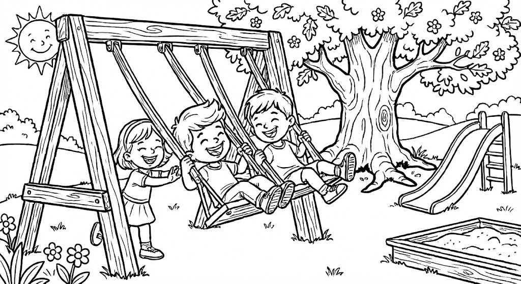 🛝 Playground Coloring Page - Kids, Trees, Play Area and Slide